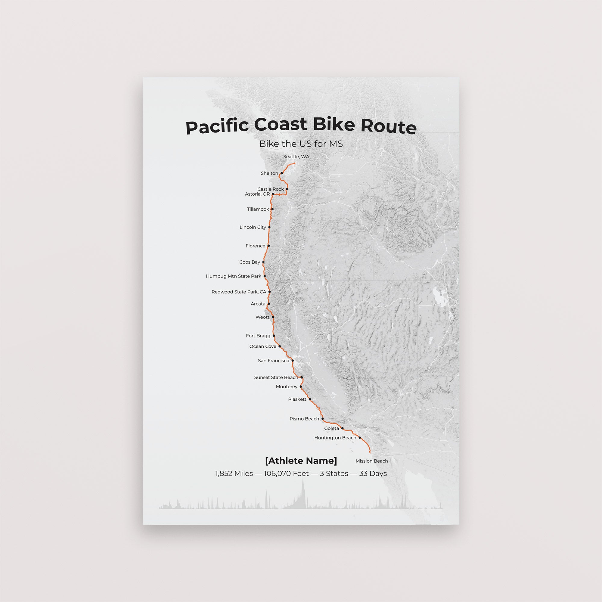 Celebrate this epic ride with a beautifully designed map print of the Bike the US for MS Pacific Coast Bike Route. Each print can be customised with your personal ride details — dates, distances, elevation, milestones, and even a dedication message — creating a one-of-a-kind keepsake of your journey.