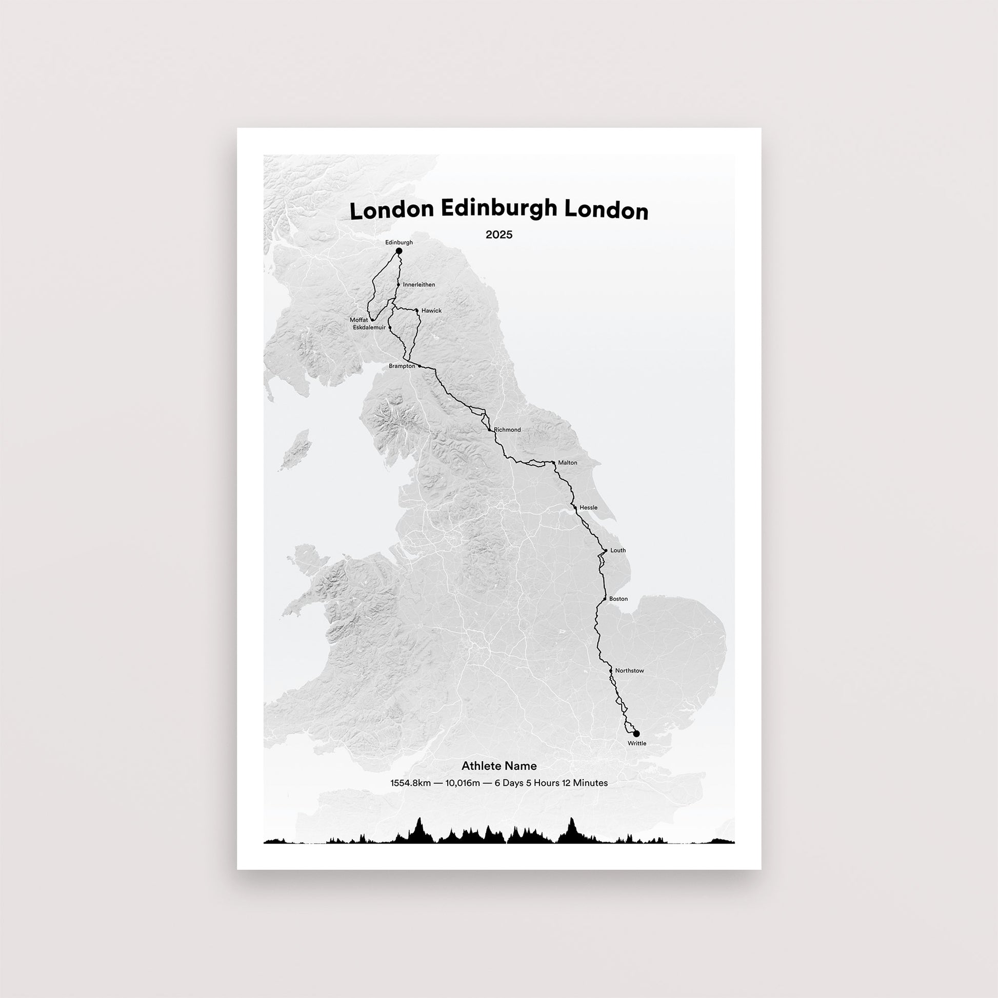 Your LEL print will be designed with precision and care, featuring the full iconic route from London to Edinburgh and back. You can make it your own by customising: