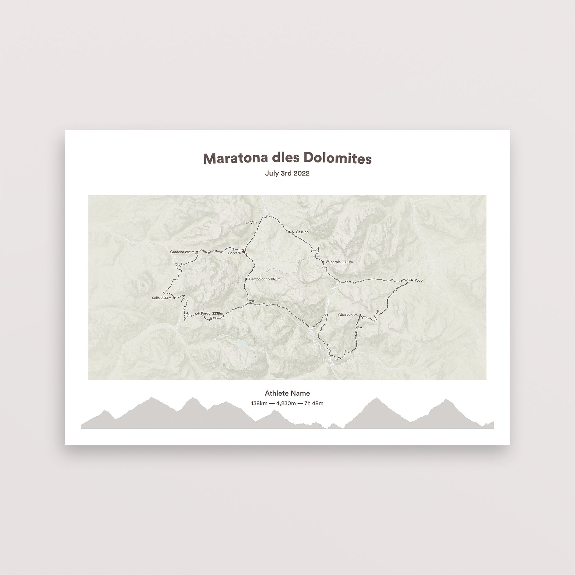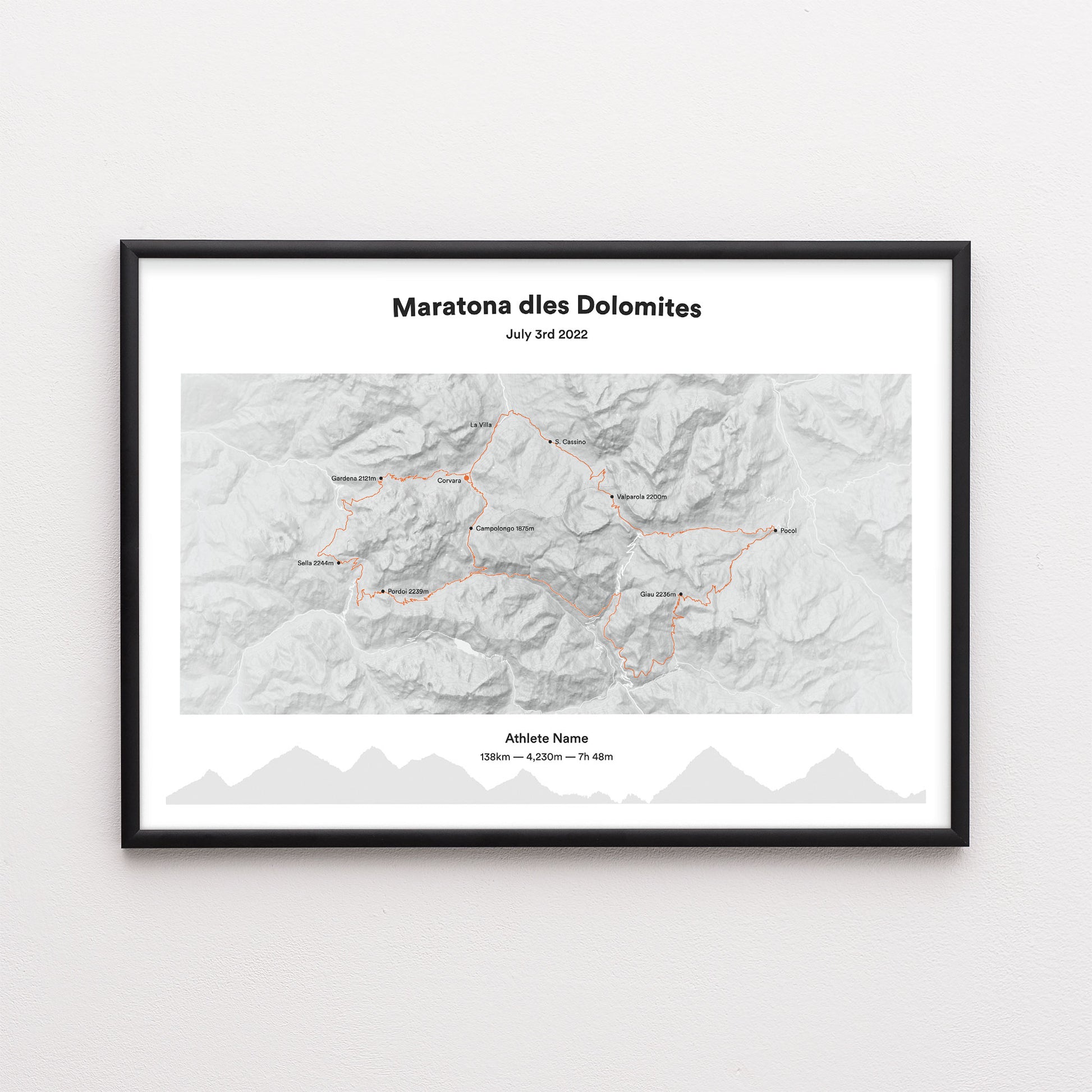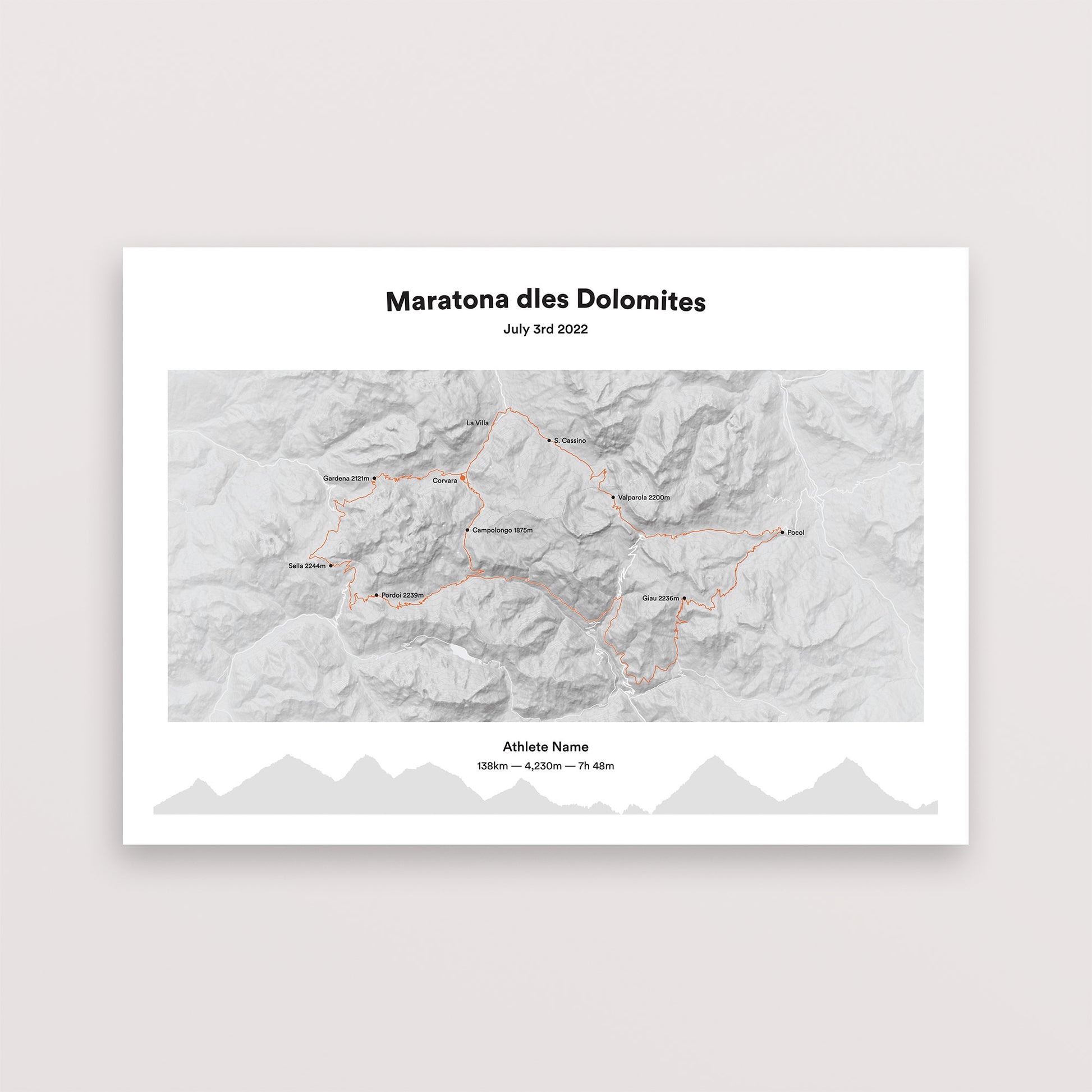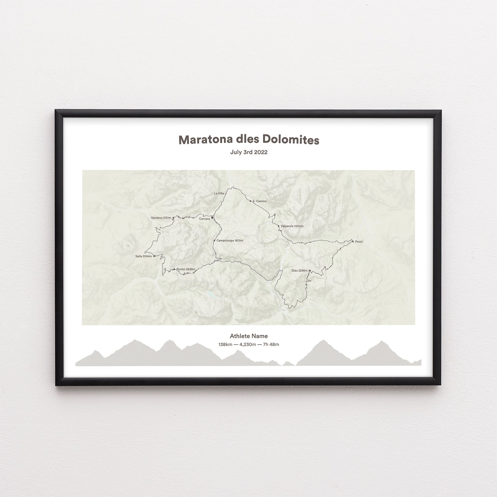 Our Maratona 2022 poster is a great way to celebrate this particularly tough cycling route around the Alps. If you have completed this this epic ride and you want a print for your wall, add your details (feel free to add changes to the other text fields too) and we will get your sorted.
