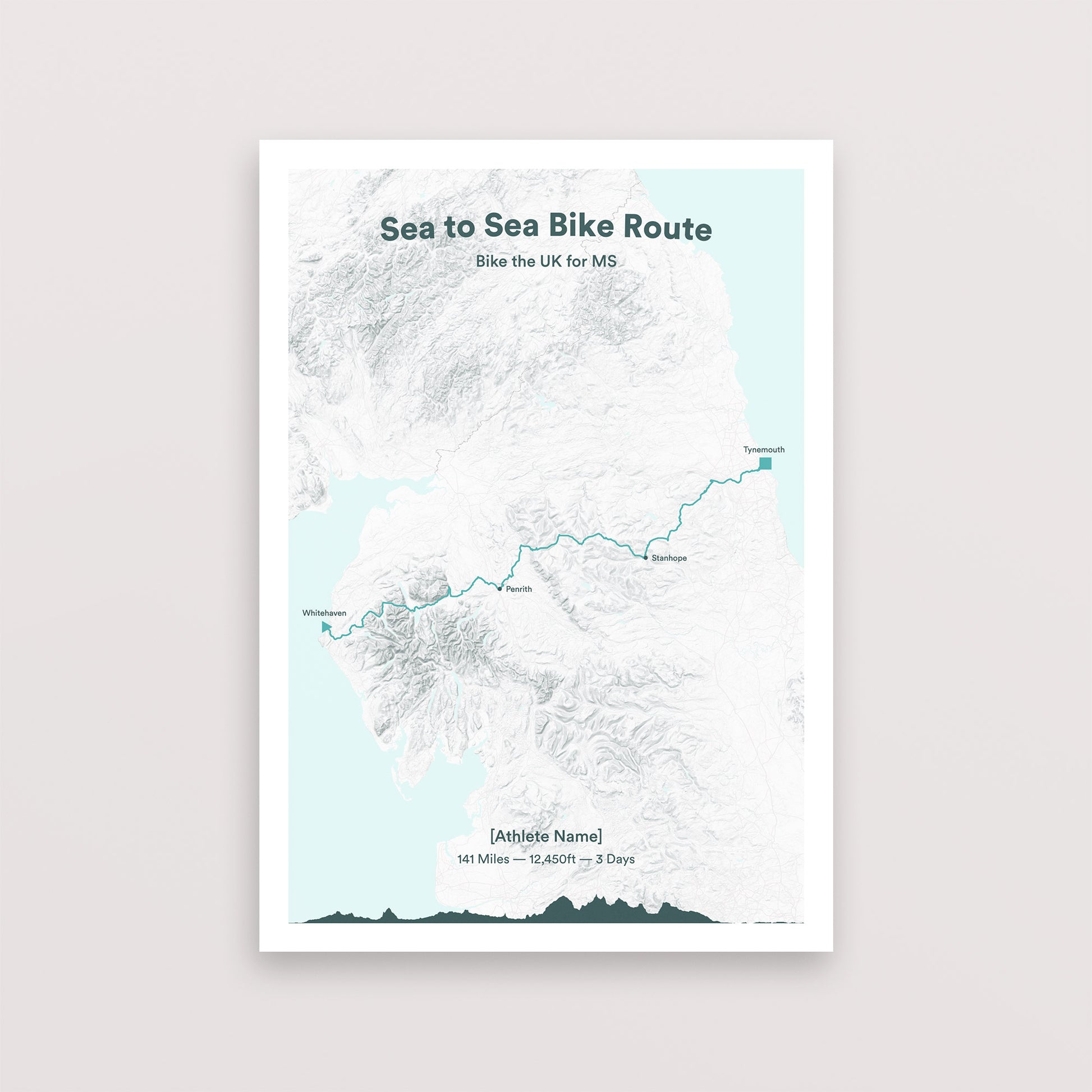Celebrate this epic ride with a beautifully designed map print of the Bike the UK for MS Sea to Sea Route. Each print can be customised with your personal ride details — dates, distances, elevation, milestones, and even a dedication message — creating a one-of-a-kind keepsake of your journey.